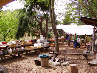 Kitchen is ready to go. Really nice design. Easy to clean, nice if you live in outdoor weather and especially if nature surrounds you.......and you have a bunch of people in the kitchen. This kitchen has no fridge but has propane hookups for the stove/oven and on-demand hot water (just like Japan). The floor is wood chips so we don't kick up dust and an opaque tarp to keep rain out and sunlight in.